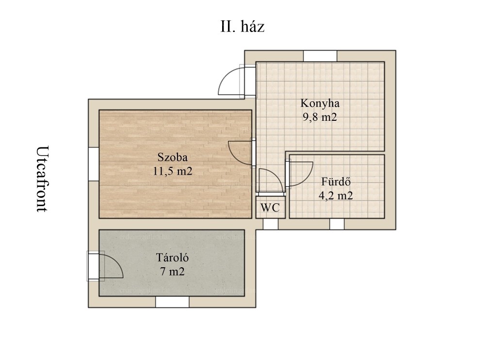 A II. ház téglaépítésű, 33 m²-es, konyha, 1 egész szoba, fürdőszoba, külön WC és egy külső tároló kapott helyet.