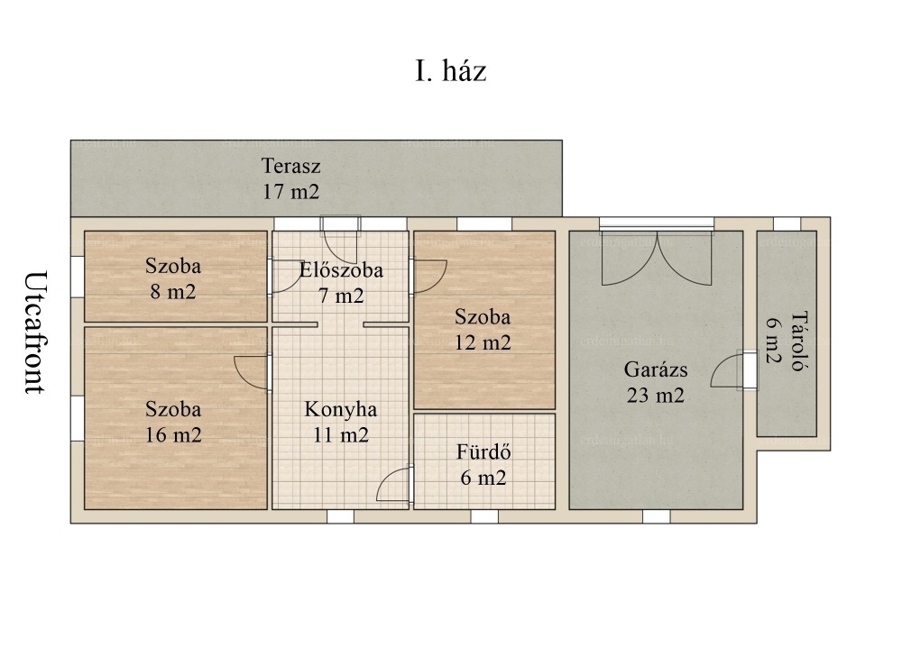 Az I. ház vegyes falazatú, 60 m² nagyságú, konyha, 1 egész és 2 félszoba, fürdőszoba és előszoba került kialakításra, a bejárat előtt egy 17 m²-es terasz található. Kapcsolódik a házhoz egy 23 m²-es garázs és egy innen nyíló 6 m²-es tároló is. A háztól néhány méterre található a másik 15 m²-es garázs.