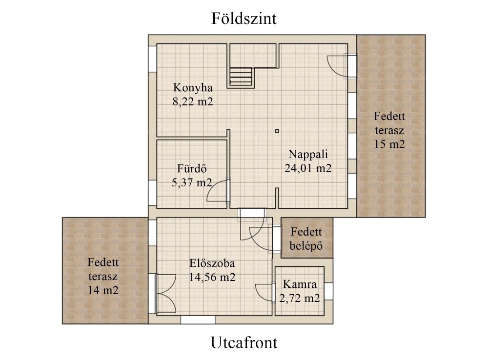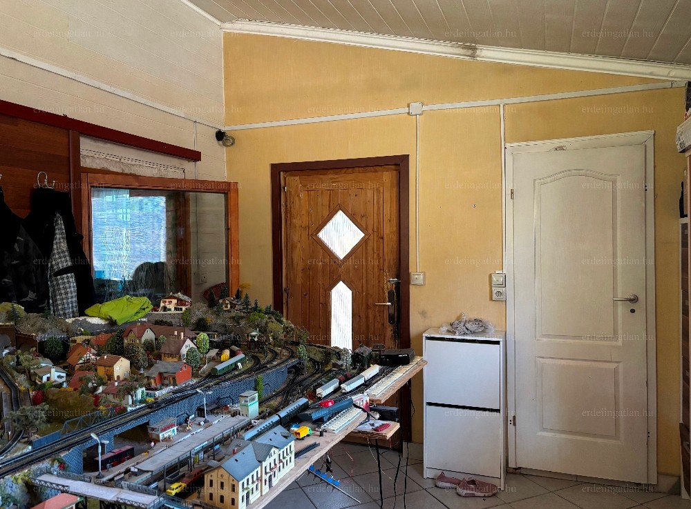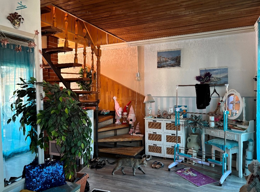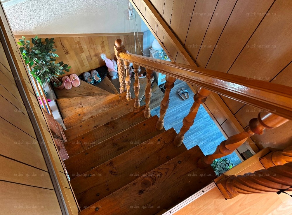 A 3 szintes épület 1990-ben épült könnyűszerkezetes építési móddal (betonyp). A földszinten található egy tágas előszoba, egy kamra, egy konyha-étkező- nappali és egy fürdőszoba. Az előszobából egy 14 m²-es fedett teraszra jutunk, ami a hátsó kertrészre néz.