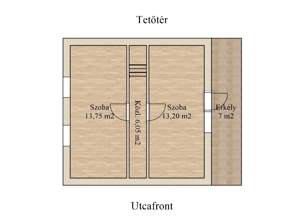 A tetőtérben 2 hálószoba található, az egyikhez egy 15 m²-es erkély kapcsolódik. A szuterén 40 m²-es, egyterű, jelenleg tárolásra használják.