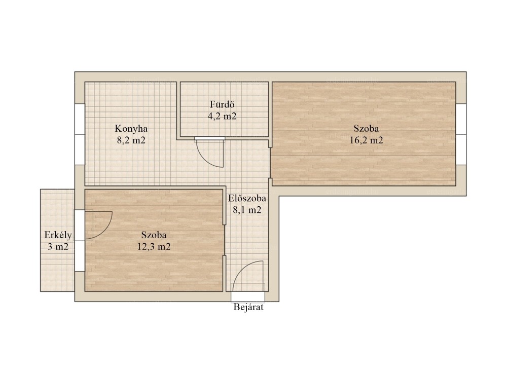 Az ingatlanban 2 külön nyíló szoba, konyha, fürdőszoba, előszoba és egy 3 m²-es erkély kapott helyet. Rendelkezésre áll a pincében egy 3 m²-es tároló is.