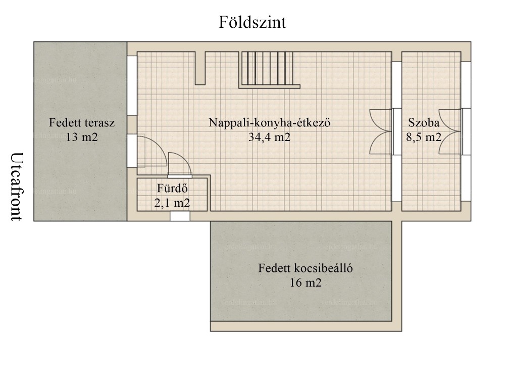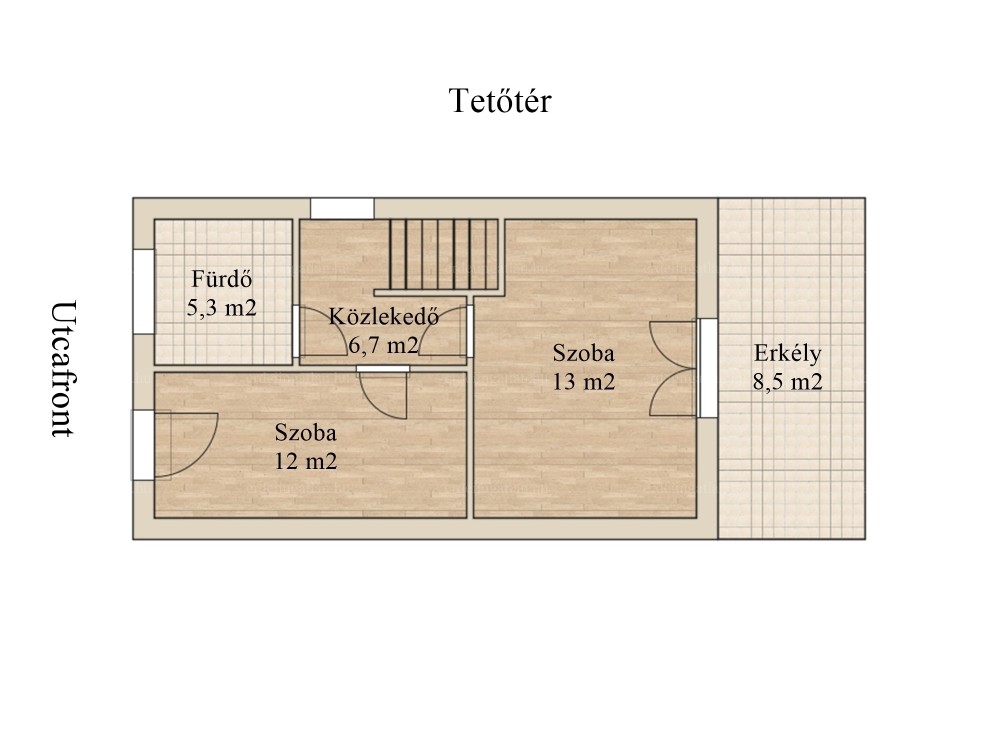 A bejárattal kapcsolódó 13 m²-es fedett terasz, a további kényelmünket szolgálja.