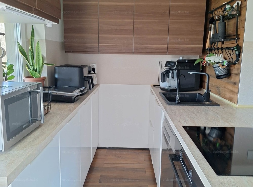 Alsó szinten gépesített amerikai konyha, nappali, kisebb félszoba különleges kilátással a tóra, toalett zuhanyozóval kapott még helyet.