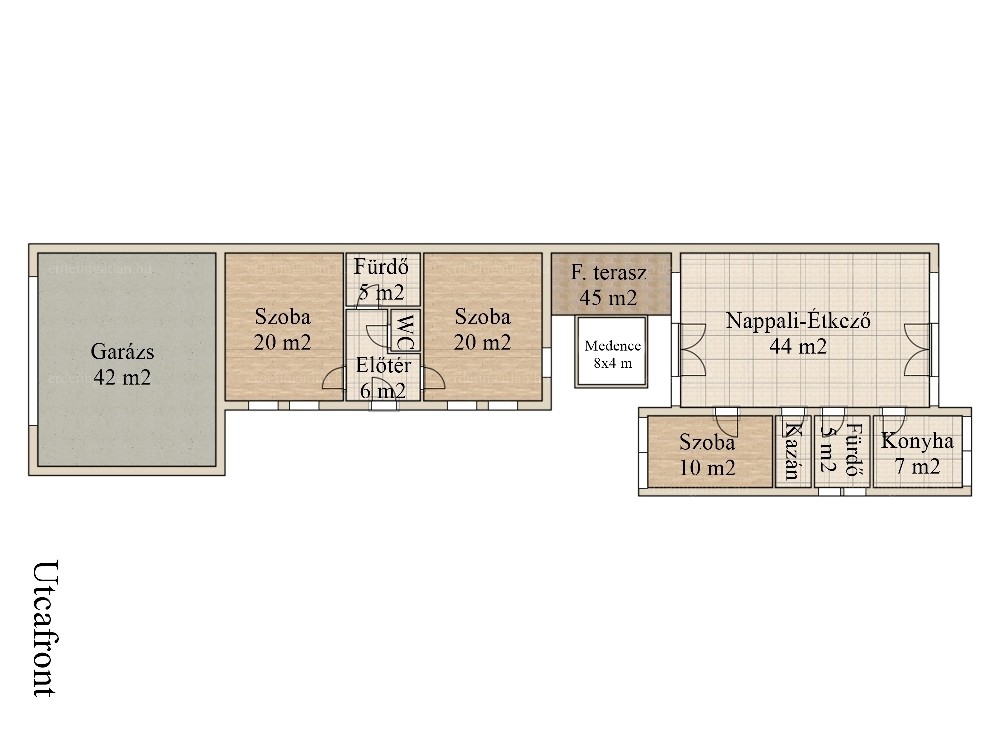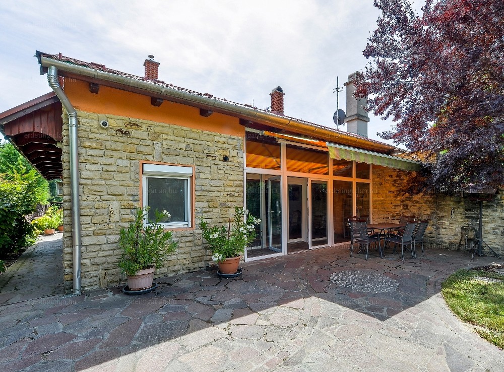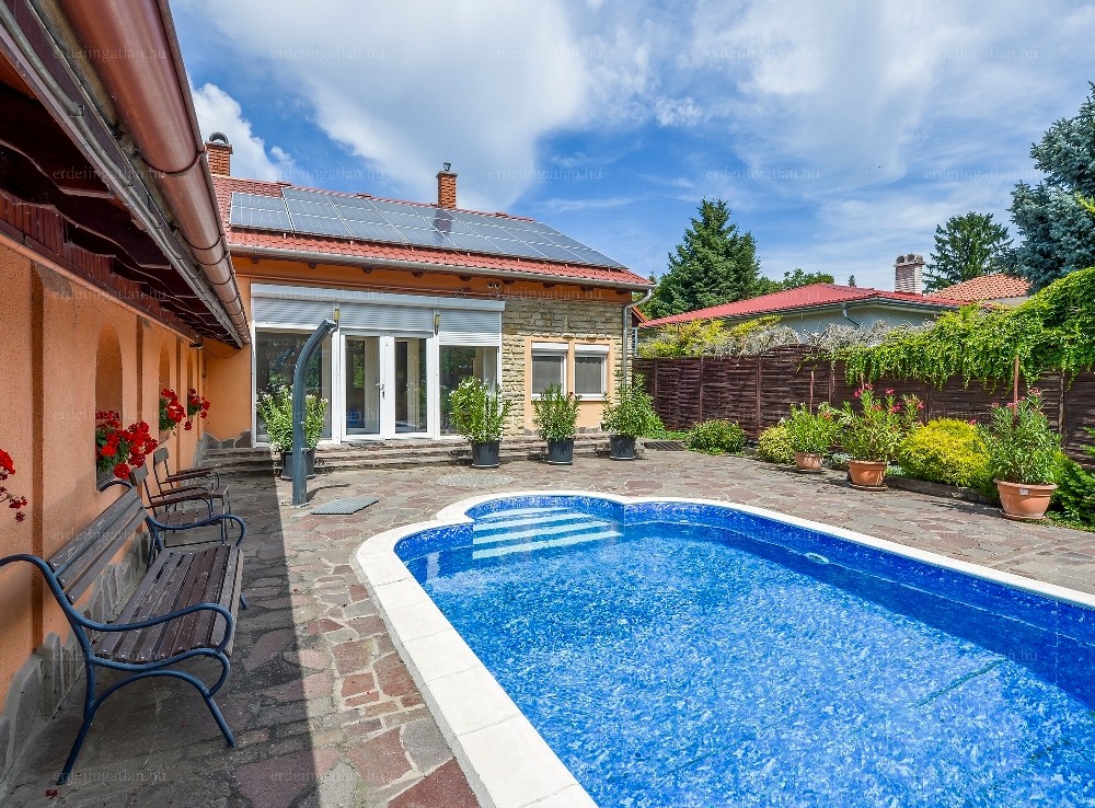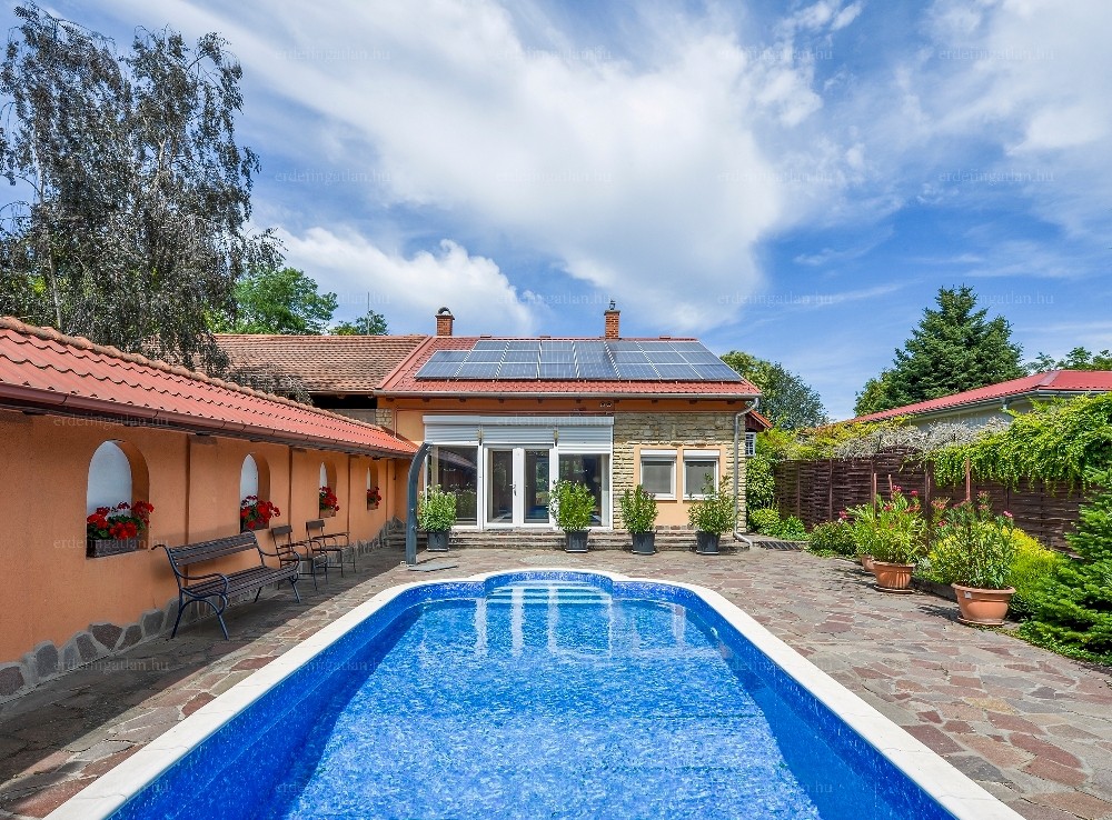 A főépület 100 m², belmagassága 5,6 m, látványos panorámás ablakaival a Dunára, és a két épület közötti 4 x 8 m fűthető medencés, mediterrán hangulatú kertre nyílik.